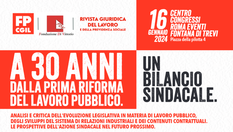 Si terrà martedì 16 gennaio, presso il Centro Congressi Roma Eventi Fontana Di Trevi, Piazza della Pilotta n.4, l'iniziativa "A 30 anni dalla prima riforma del lavoro pubblico. Un bilancio sindacale", promossa da Fp cgil, Fondazione Di Vittorio e Rivista Giuridica del Lavoro.