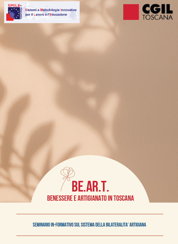 Il percorso Be.Ar.T. (Benessere e artigianato in Toscana), organizzato da Smile e Cgil Toscana, è articolato su tre giornate (per un totale di 15 ore) e si pone l’obiettivo di fare il punto della situazione dell’artigianato in Toscana, andando ad analizzare quegli elementi – come il sistema della bilateralità e la formazione – su cui fare leva per un miglioramento continuo del benessere del Settore. Be.Ar.T. è l’evento di avvio di ulteriori, possibili, percorsi di formazione, approfondimento, riflessione territoriali, progettati su misura, sul sistema delle bilateralità artigiana.