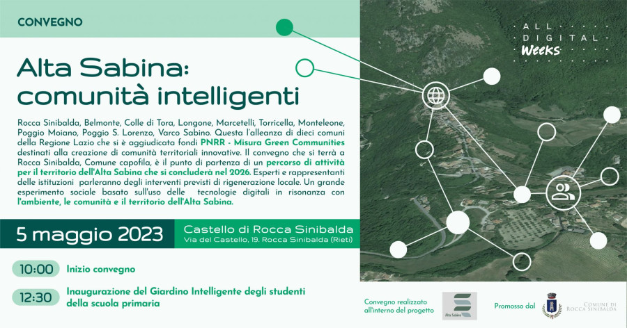 Il progetto PNRR-Green Communities Community Sustainable Resonance - CSR Alta Sabina che la Fondazione Giuseppe Di Vittorio ha progettato a fianco di un'alleanza di scopo di 10 comuni - di cui il Sindaco di Rocca Sinibalda, Stefano Micheli, è il Capofila - verrà presentato il prossimo venerdì 5 maggio, dalle ore 10.00, al Castello di Rocca Sinibalda* durante l’evento “Alta Sabina - Comunità Intelligenti” e all’interno della campagna europea All Digital Weeks, coordinata, in Italia, da Stati Generali dell'Innovazione (https://www.statigeneralinnovazione.it/all-digital-weeks-2023/)