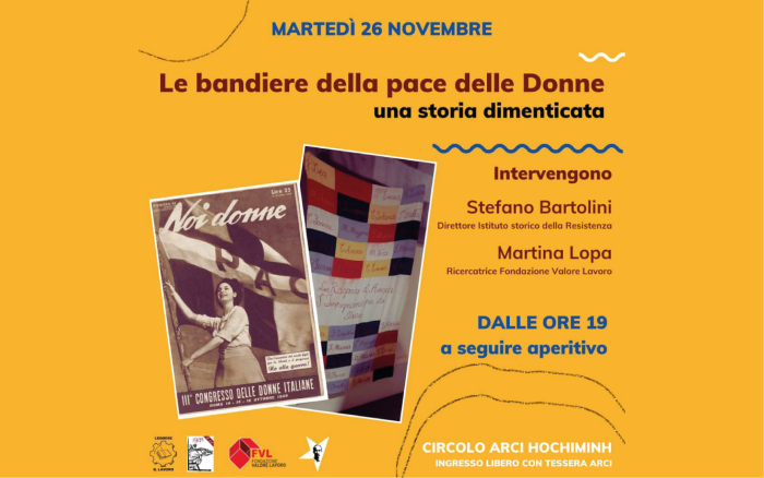 La Fondazione ValoreLavoro è lieta di invitarvi all’iniziativa realizzata in collaborazione con l’Istituto storico della Resistenza e dell’età contemporanea di Pistoia e al Circolo ARCI “Ho Chi Minh” dal titolo: Le bandiere della pace delle Donne. Una storia dimenticata che si svolgerà il 26 novembre a Pistoia.