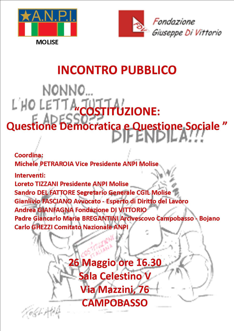Incontro pubblico organizzato, a Campobasso il 26 maggio alle ore 16.30, dall'ANPI Molise in collaborazione con la CGIL e la Fondazione "Di Vittorio" in difesa della Costituzione e dello Statuto dei lavoratori.