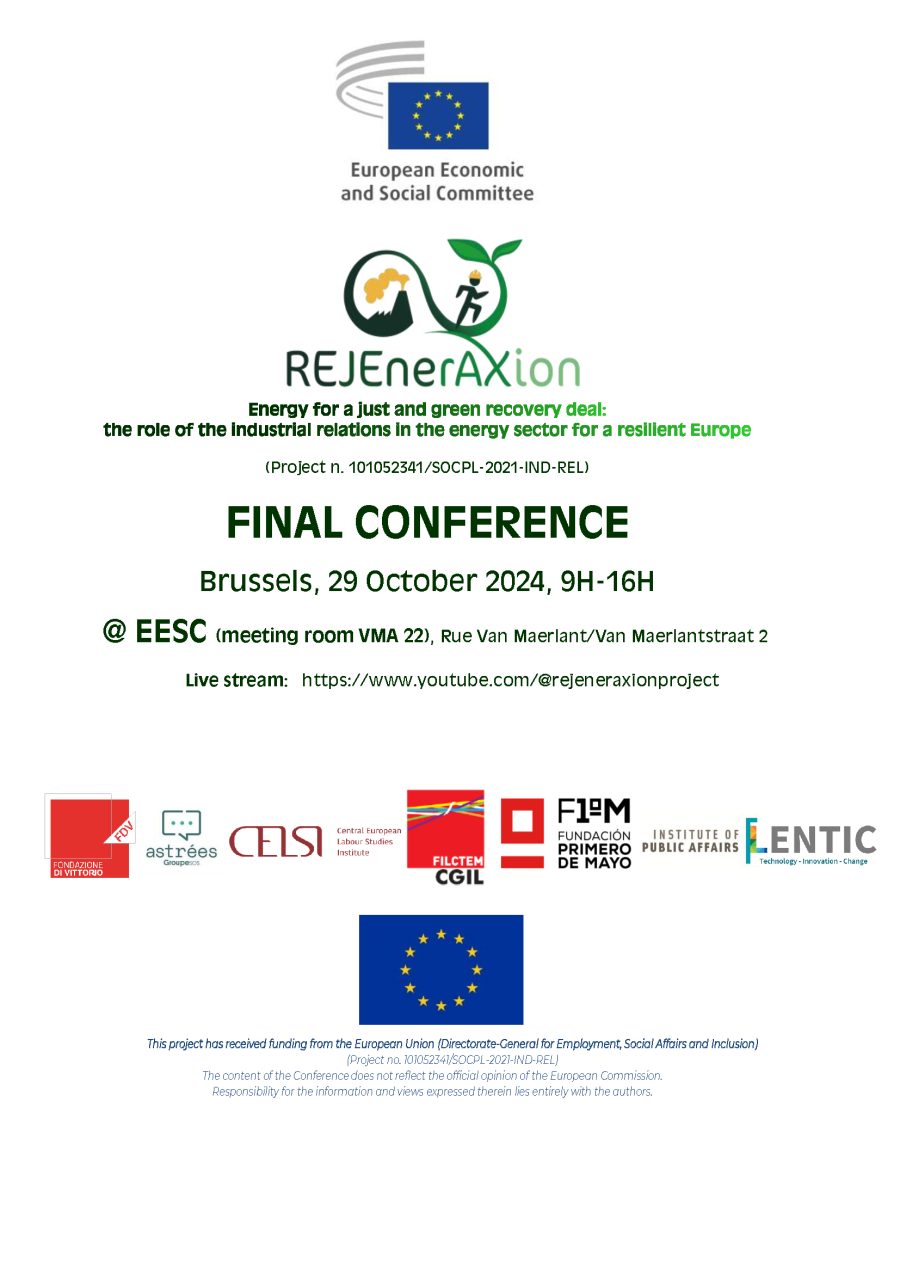 Si svolgerà a Bruxelles il 29 Ottobre, presso il CESE - Comitato Economico e Sociale Europeo (meeting room VMA 22), Rue Van Maerlant/Van Maerlantstraat 2 e in diretta streaming (in allegato l’agenda dei lavori), il convegno finale del progetto europeo REJEnerAXion “Energy for a just and green recovery deal: the role of the industrial relations in the energy sector for a resilient Europe”. Il progetto, coordinato dalla Fondazione Di Vittorio, mira ad analizzare e rafforzare il ruolo delle strutture innovative di relazioni industriali, compreso il dialogo sociale, per rispondere alle principali sfide e opportunità di una giusta transizione verso l'energia pulita a livello nazionale ed europeo.