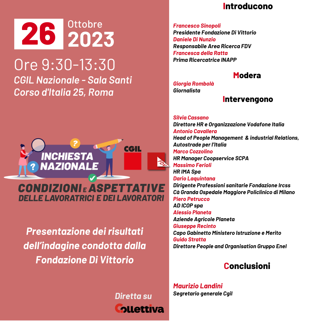Presentata giovedi 26 ottobre, presso la sede della Cgil, l'inchiesta “Condizioni di lavoro e le aspettative delle lavoratrici e dei lavoratori”, alla presenza di esponenti del mondo datoriale,  delle ricercatrici e dei ricercatori coinvolti, del presidente della Fdv Francesco Sinopoli e del segretario generale della Cgil, Maurizio Landini.