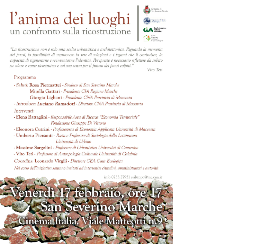 Venerdì 17 febbraio, alle ore 17, a San Severino Marche, presso il Cinema Italia, Viale Matteotti, 9 avrà luogo un convegno dal titolo: "L'anima dei luoghi. Un confronto sulla ricostruzione". L'evento è organizzato dal Comune di San Severino Marche, CNA, CIA e Centro Educazione Ambientale Casa Ecologica.