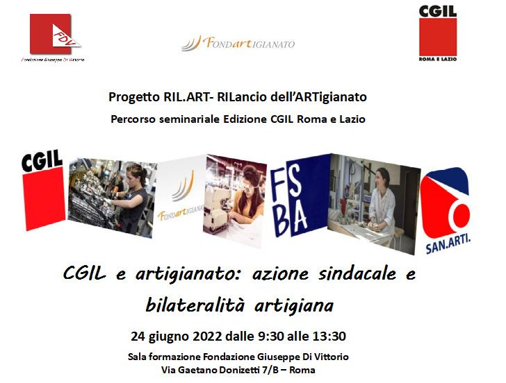 Il progetto RIL.ART – RILancio dell’ARTigianato, azione propedeutica finanziata da Fondartigianato nella Programmazione 2020, promosso dalla CGIL Nazionale e coordinato dalla Fondazione Giuseppe Di Vittorio prosegue con l’edizione seminariale promossa dalla CGIL di Roma e del Lazio e dedicata all’approfondimento degli strumenti e delle prestazioni della bilateralità artigiana. Il seminario si svolgerà il 24 giugno 2022 dalle 9.30 alle 13.30 presso la sede della Fondazione Di Vittorio, in via Donizetti 7/B. Nell’ambito del seminario verranno trattati i seguenti temi: l’esperienza della CGIL di Roma e del Lazio nel comparto artigiano, Ammortizzatori sociali e FSBA, le prestazioni di tutela sanitaria per l’artigianato di San.Arti, la programmazione formativa di Fondartigianato e le linee di azione future della CGIL di Roma e del Lazio nel comparto artigiano.