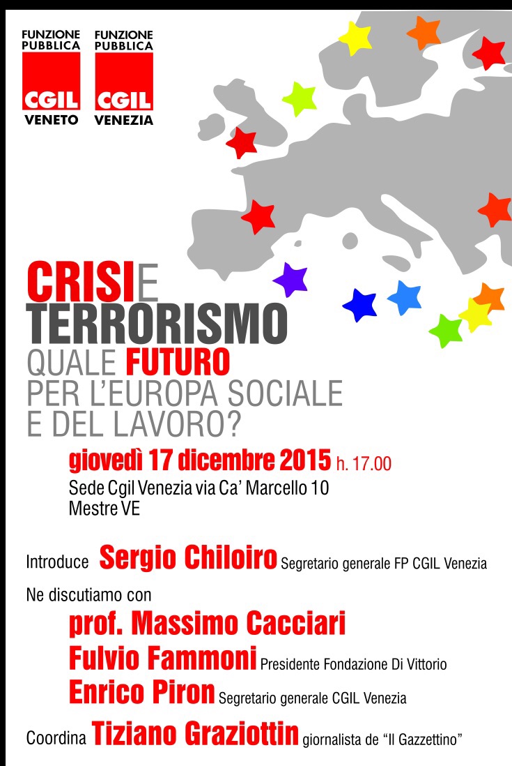 Lo scorso 17 dicembre la Funzione Pubblica Cgil Veneto e Funzione Pubblica Cgil Venezia hanno ospitato Massimo Cacciari, Fulvio Fammoni (Fondazione Giuseppe Di Vittorio) ed Enrico Piron (Segretario Generale Cgil Venezia) per discutere di crisi, terrorismo, sindacato.