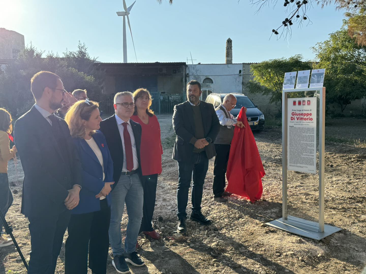 Una base di muretto a secco, caratteristica del paesaggio rurale pugliese, dal 2018 riconosciuti come patrimonio Unesco. Sormontato da tre sagome ricavate dai contorni di storiche immagini che lo ritraggono in alcuni. È l’installazione artistica dedicata a Giuseppe Di Vittorio e inaugurata oggi in località Masseria Cirillo, in agro di Orta Nova, che fu il primo luogo di lavoro del giovanissimo Peppino.