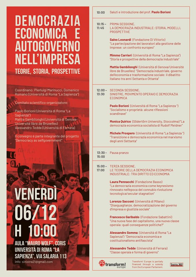 “Democrazia economica e autogoverno nell’impresa. Teorie, storia, prospettive” è il titolo del convegno promosso dall’associazione Sinistra XXI e da Transform! Europe nel quadro del progetto “Democracy as selfgovernment”.