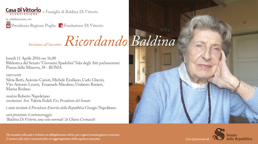 “Ricordando Baldina” è l’iniziativa promossa per lunedì 11 aprile da Associazione Casa Di Vittorio e Famiglia Baldina Di Vittorio, in collaborazione con Presidenza Regione Puglia e la Fondazione Di Vittorio, che si terrà dalle ore 16.00 presso la Biblioteca del Senato "Giovanni Spadolini", Sala degli Atti Parlamentari, in Piazza della Minerva, 38 a Roma.
