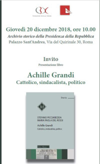 Il volume, “Achille Grandi. Cattolico, sindacalista, politico”, di Stefano Picciaredda e Maria Paola Del Rossi, sarà presentato a Roma, giovedì 20 dicembre 2018 con inizio alle ore 10.00, presso l’Archivio storico della Presidenza della Repubblica (Palazzo Sant’Andrea. Via del Quirinale 30). All’iniziativa organizzata dalla Fondazione Achille Grandi e dalla Fondazione Giuseppe Di Vittorio, per la CGIL parteciperà il Segretario Generale Susanna Camusso. Saranno inoltre presenti esponenti del mondo sindacale, del giornalismo e delle Fondazioni. E’ possibile iscriversi al link seguente. L'iscrizione deve essere fatta entro il 15 dicembre. https://forms.office.com/Pages/ResponsePage.aspx?id=0TgXo9kJn0ieJDVOoG4EcgOpZAsWRflFl6sws1tZxbBUMzU5SDM0QkVHMDFVSEpaWEdYSjdSUTVCVC4u